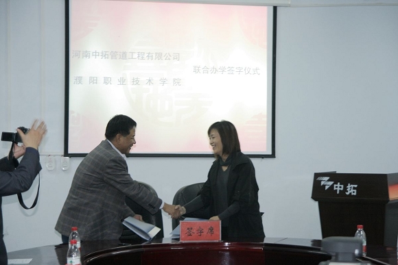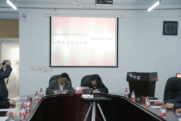 經(jīng)過前期周密細(xì)致的洽談準(zhǔn)備工作,河南中拓管道工程有限公司與濮陽職業(yè)技術(shù)學(xué)院聯(lián)合辦學(xué)簽字儀式于2010年10月13日下午在公司二樓會議室隆重召開。
