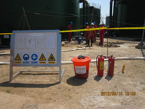 清洗工程進(jìn)展順利,施工現(xiàn)場、設(shè)備、機(jī)具、工具分類擺放整齊,設(shè)備管理實行定崗定人,掛牌專人維護(hù)、操作,F(xiàn)場文明施工,警示帶、警示牌、醫(yī)藥箱、易燃?xì)怏w檢測儀,安全防范措施到位,用電線路架空規(guī)范,環(huán)保意識強(qiáng),備有雜物桶,大罐進(jìn)出口地面墊有塑料防滲膜。施工現(xiàn)場 文明施工,規(guī)范化管理,隊伍的士氣和形象受到采油四廠領(lǐng)導(dǎo)、安全科領(lǐng)導(dǎo)的高度評價和表揚。采油四廠黨委辦公室、宣傳科、局電視臺進(jìn)行了現(xiàn)場采訪。