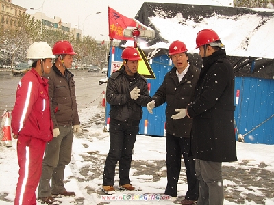 12月8日中午,天空卷起了鵝毛大雪,路上積雪足有四五厘米厚,就在今天,徐總與張總冒著嚴(yán)寒積雪以及交通不便的惡劣條件來到我們?yōu)H坊項目部進(jìn)行慰問和工作指導(dǎo)。