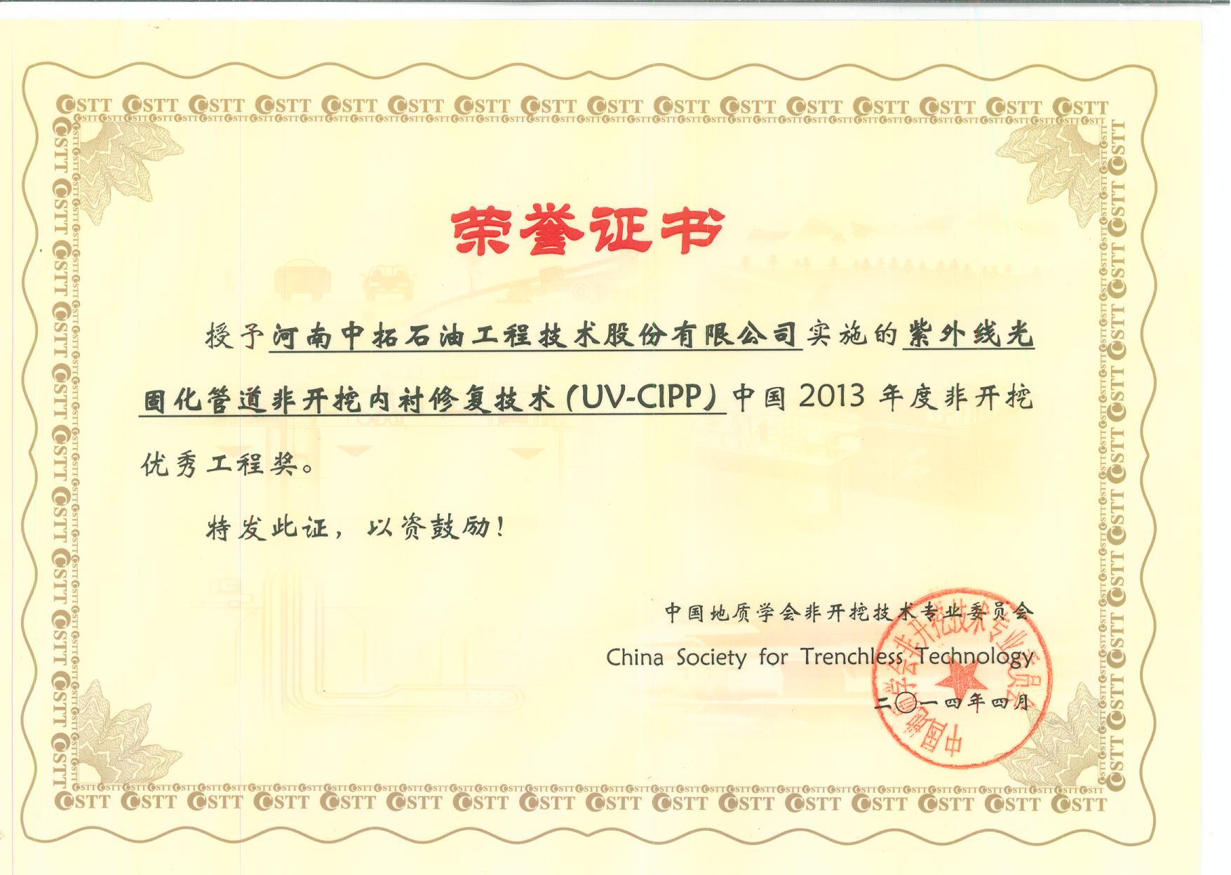 根據(jù)協(xié)會(huì)的安排我公司就《管道替換與修復(fù)技術(shù)規(guī)程》在專題會(huì)上進(jìn)行了宣貫。我公司實(shí)施的天津開發(fā)區(qū)取水管道CIPP內(nèi)襯修復(fù)工程和紫外線光固化管道非開挖內(nèi)襯修復(fù)技術(shù)(UV-CIPP)榮獲中國(guó)2013年度非開挖優(yōu)秀工程獎(jiǎng)。