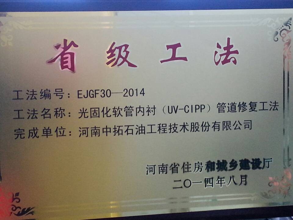 經(jīng)河南省住房和城鄉(xiāng)建設(shè)廳組織專家委員會(huì)評(píng)選、評(píng)委會(huì)審議并經(jīng)網(wǎng)上公示,我公司獲得一項(xiàng)河南省省級(jí)工法,工法名稱為“光固化軟管內(nèi)襯(UV-CIPP)管道修復(fù)工法”。上述工法的獲得,表明公司的科研成果得到了政府部門的充分肯定和認(rèn)可,展示了公司管道修復(fù)的科研實(shí)力,同時(shí)為今后繼續(xù)申報(bào)國家級(jí)工法做好準(zhǔn)備,為申報(bào)政府科研項(xiàng)目、科技品牌建設(shè)再添科研成果奠定基礎(chǔ)。